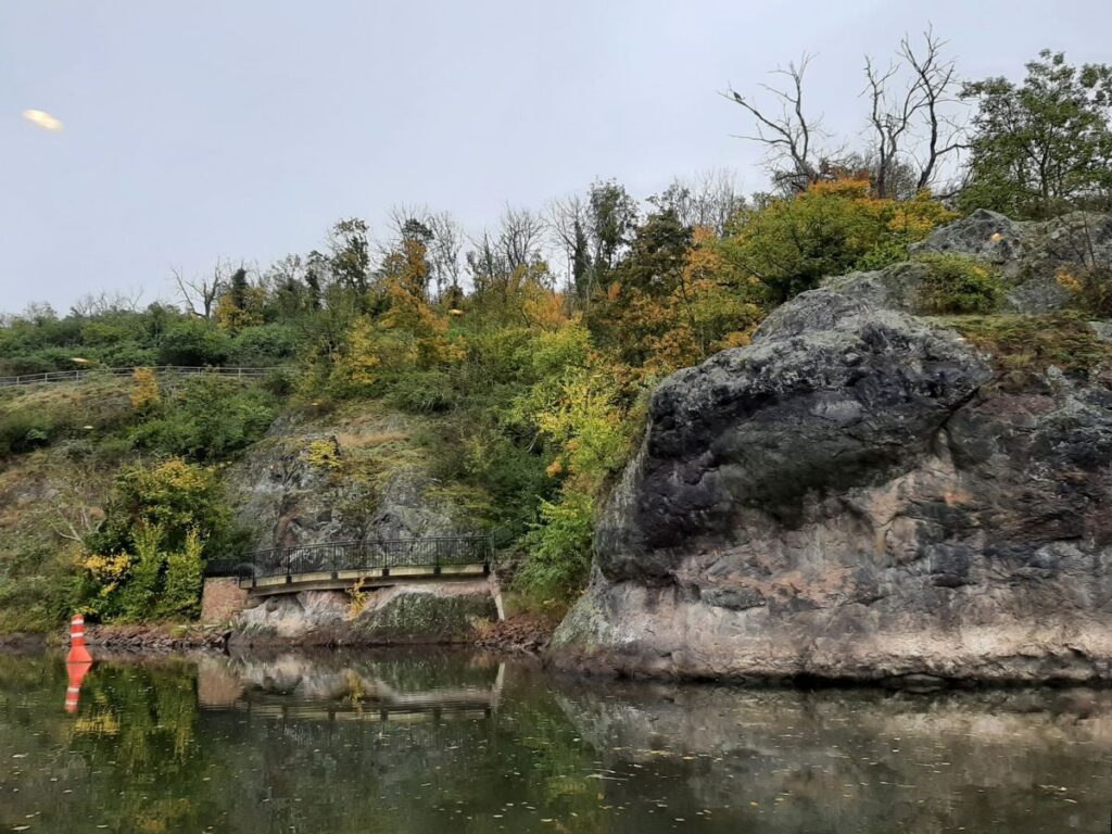 Mit der MS ‚Händel II‘ ging es bei bedecktem Himmel vom Riveufer aus unter der Giebichensteinbrücke hindurch, vorbei am ‚Krug zum Grünen Kranze‘ und den Klausbergen zur Trothaer Schleuse. Vorbei an den Hafenanlagen, an Lettin, den Brachwitzer Alpen und der Fähre Brachwitz erreichte das Schiff die Baustelle der Saalequerung der Autobahn A 143 bei Schiepzig.