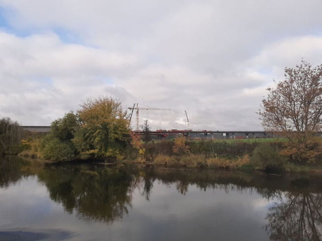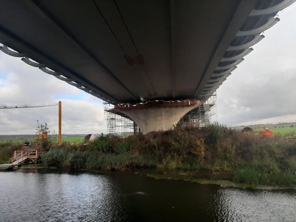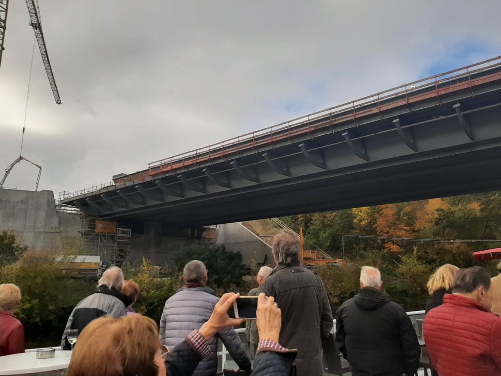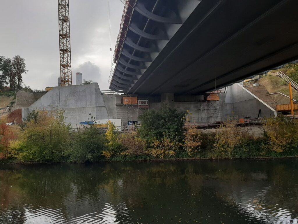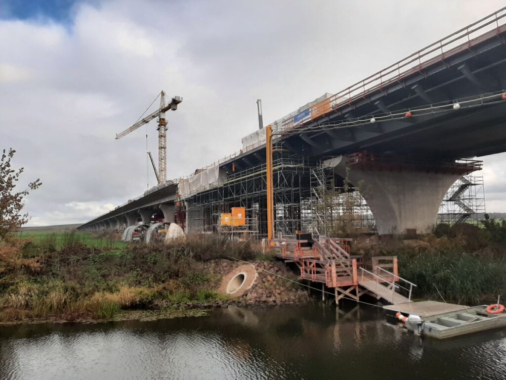 Schon von weitem waren die schlanken Stelzen der aufgeständerten Autobahn am Ostufer der Saale zu sehen. Das Brückenbauwerk wurde im Sommer von Westen her eingeschoben und ist mittlerweile für Beschäftigte passierbar. Insgesamt ist wieder eine rege Bautätigkeit zu beobachten, nachdem im Frühjahr 2025 der Betrieb einige Zeit ruhte.