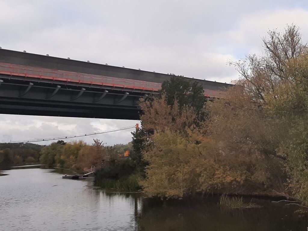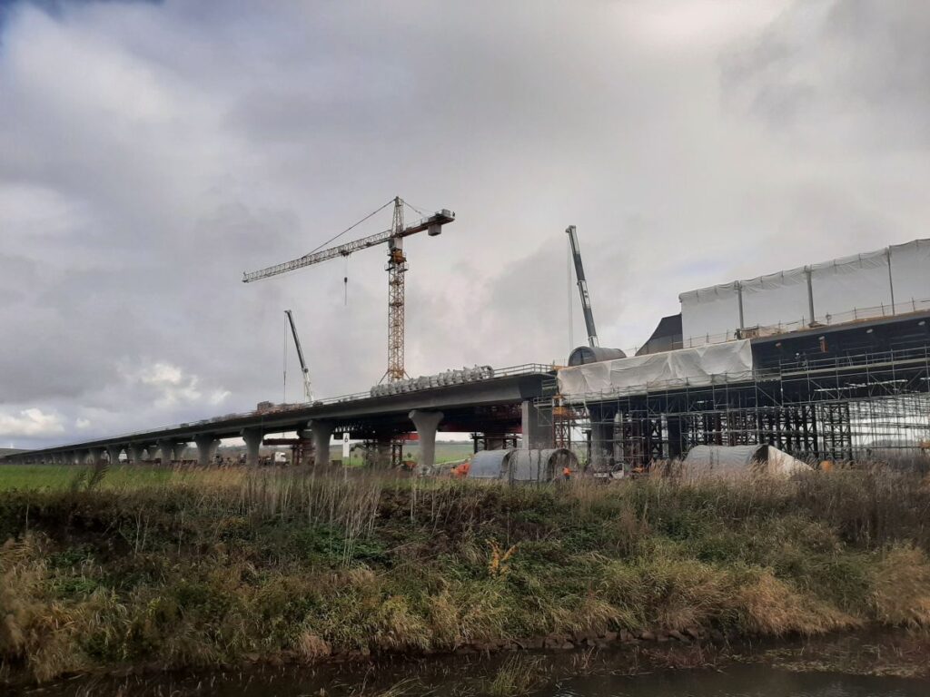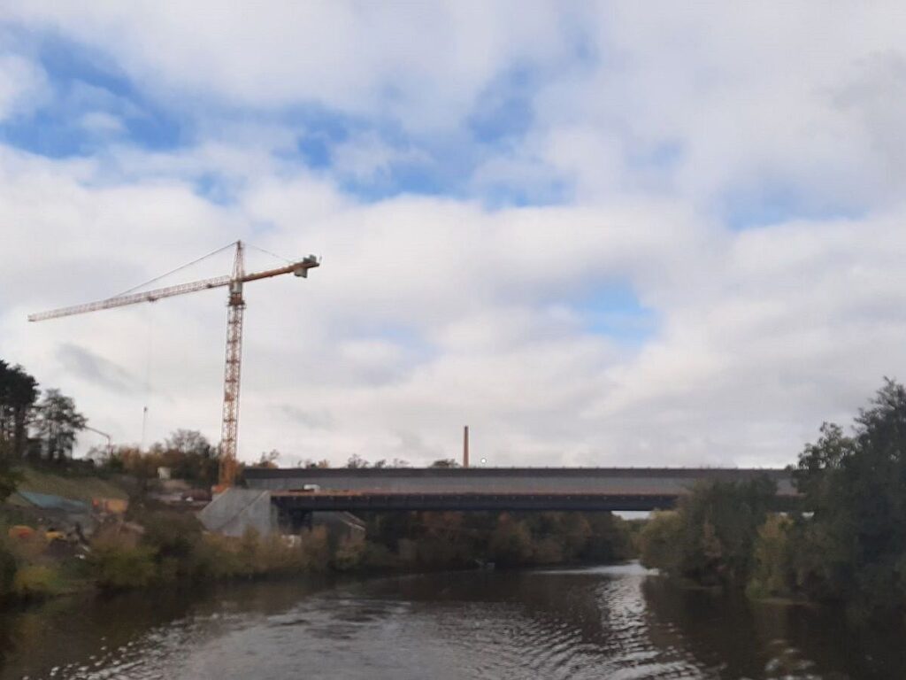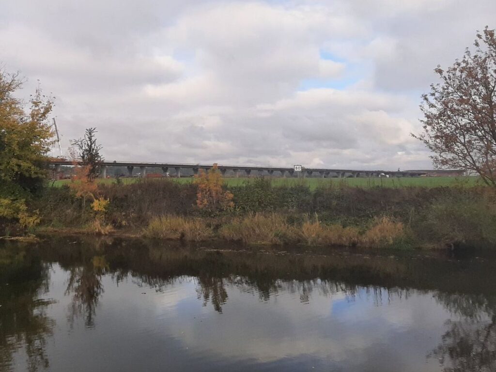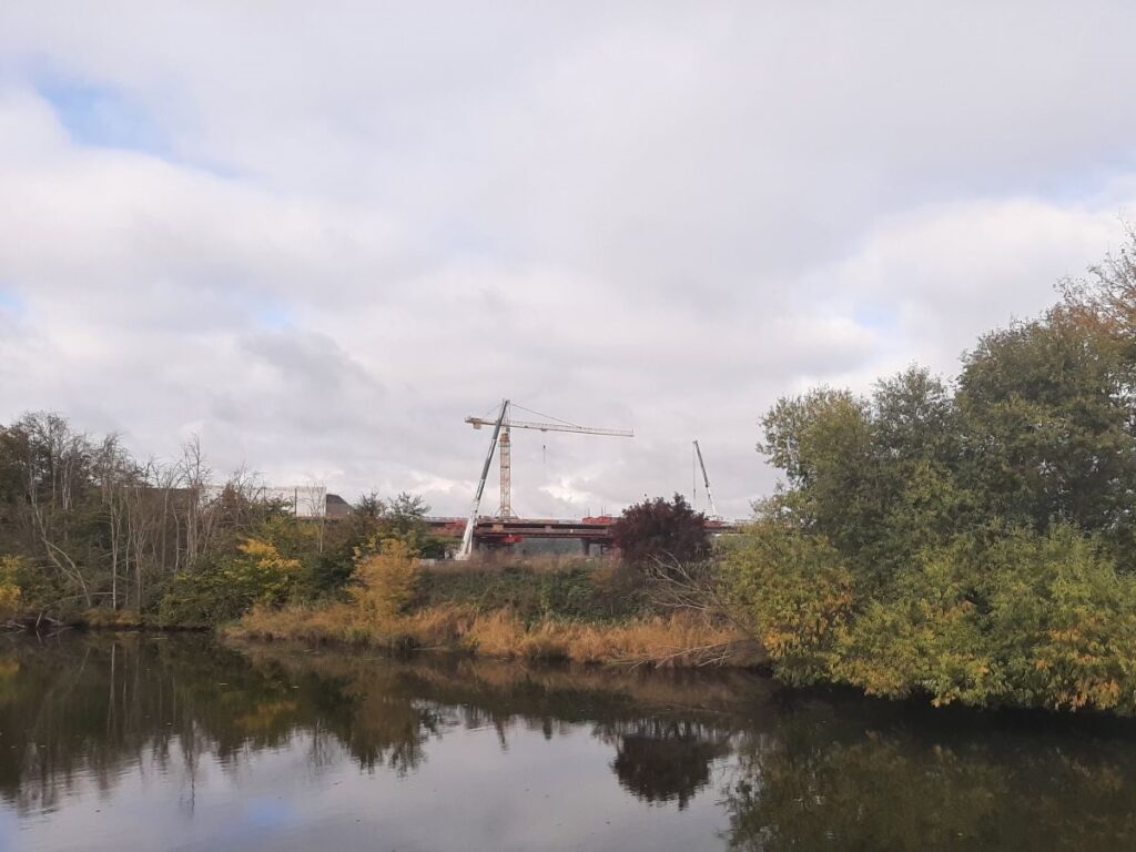 Schon von weitem waren die schlanken Stelzen der aufgeständerten Autobahn am Ostufer der Saale zu sehen. Das Brückenbauwerk wurde im Sommer von Westen her eingeschoben und ist mittlerweile für Beschäftigte passierbar. Insgesamt ist wieder eine rege Bautätigkeit zu beobachten, nachdem im Frühjahr 2025 der Betrieb einige Zeit ruhte.