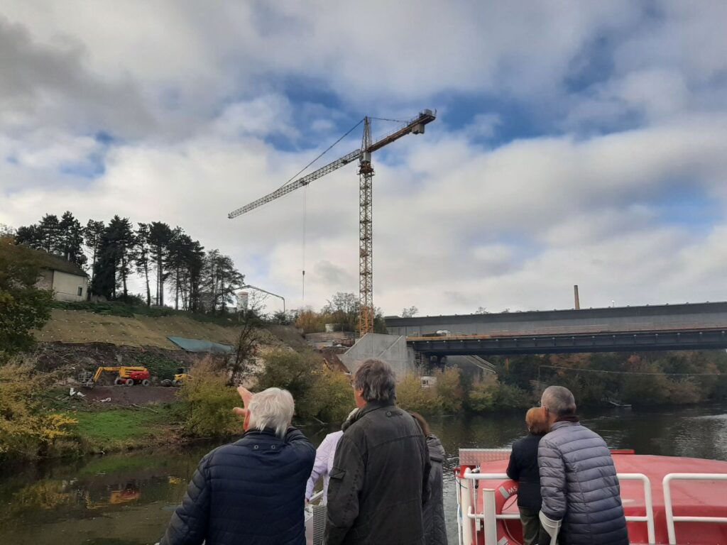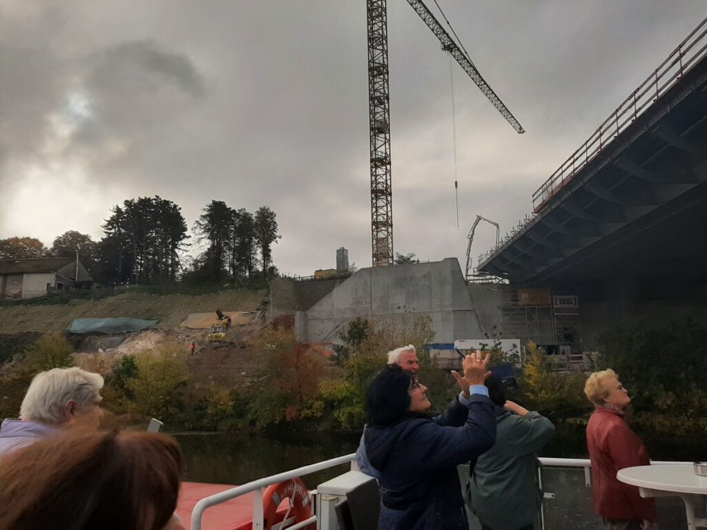 Die ‚Halle-Saale-Schifffahrt Rüdiger Ruwolt e. K.‘ bietet Touren zur Brückenbaustelle der A 143 bei Salzmünde an, die gut gebucht sind. Unser Autor konnte gerade noch rechtzeitig vor Saisonende ein Ticket für eine Abfahrt früh um 9.30 Uhr erwerben.